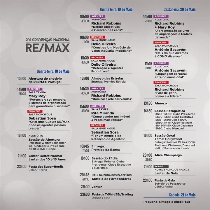 A RE/MAX Portugal irá reunir mais de 1.700 agentes na XVI Convenção RE/MAX que durante três dias decorre no Hotel Salgados Palace, no Algarve. Neste evento, os agentes com melhor performance serão premiados como forma de verem o seu trabalho reconhecido. A RE/MAX acaba também de ser reconhecida ao nível da reputação pelos consumidores, tendo sido considerada a imobiliária com melhor reputação pelo Marktest Reputation Index.